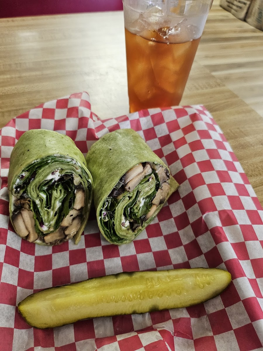This place . . . this place is great. The service is great. They learn your name and they bring your order out to you. The sandwiches are so, so good — truly, they are phenomenal. The iced herbal tea is great, whether sweet or unsweetened. The frozen drinks — smoothies and frappés — are both rich in flavor and refreshing. The atmosphere is unique, in the best possible way. Classic vinyl plays, with album artwork and related throughout the café.